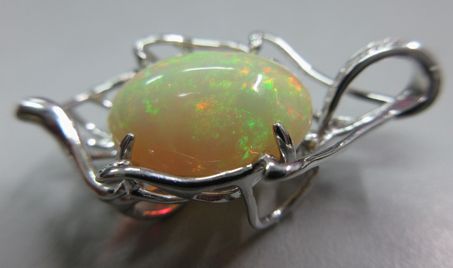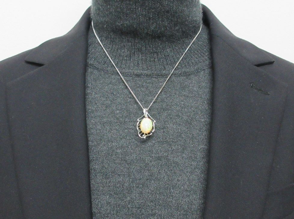 大粒のオパールを、さらに大きい葉っぱの形をした枠にすっぽりおさめたデザインは、ペンダントとしても存在感あり!