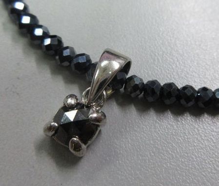 サファイアやルビーと並べて語られることもあるスピネルという宝石で作ったネックレスです。いろいろな色が産出されるスピネルには天然の黒もあるのですが、それにチタン系の材質をコーティングしたものです。